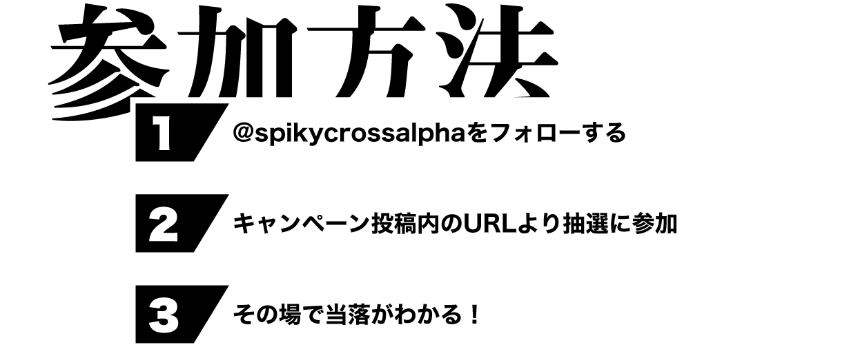当該キャンペーンを開催中のスパイキー・クロスアルファブランド公式アカウントをフォローしたのち、指定の投稿をリポストすることで応募の意思確認とさせていただきます。